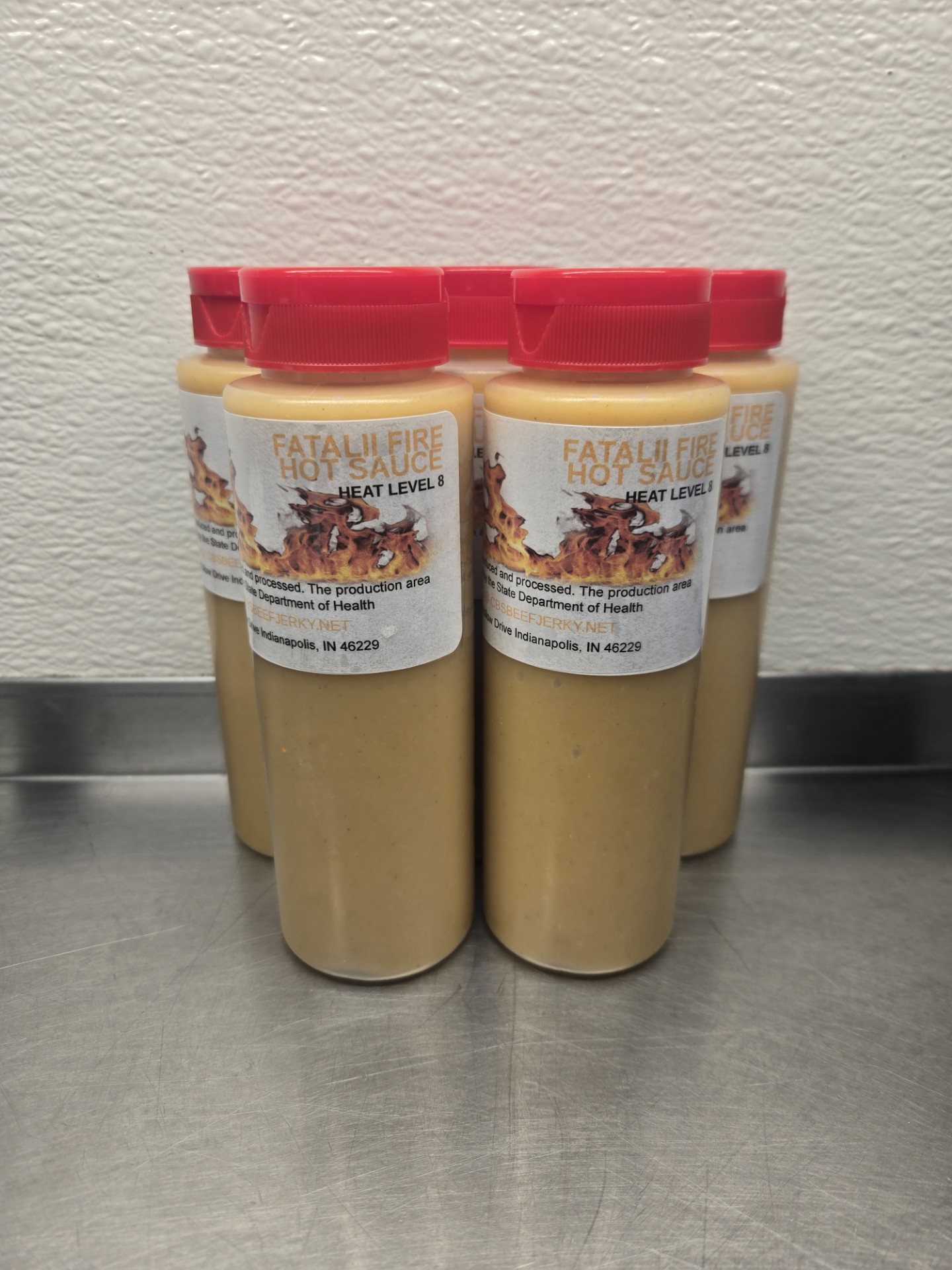 (HEAT 8) – NEW 9oz squeeze bottles! This is our newest hot sauce. The Fatalii Fire hot sauce is simply delicious and packs a pretty good punch on the heat level. We use our home grown yellow fatalii peppers in this recipe along with some salt, vinegar, citric acid and carrots as a binder and for color. It is great on anything from tacos, pizza, chicken wings, eggs and even pairs well with smoked salmon!
